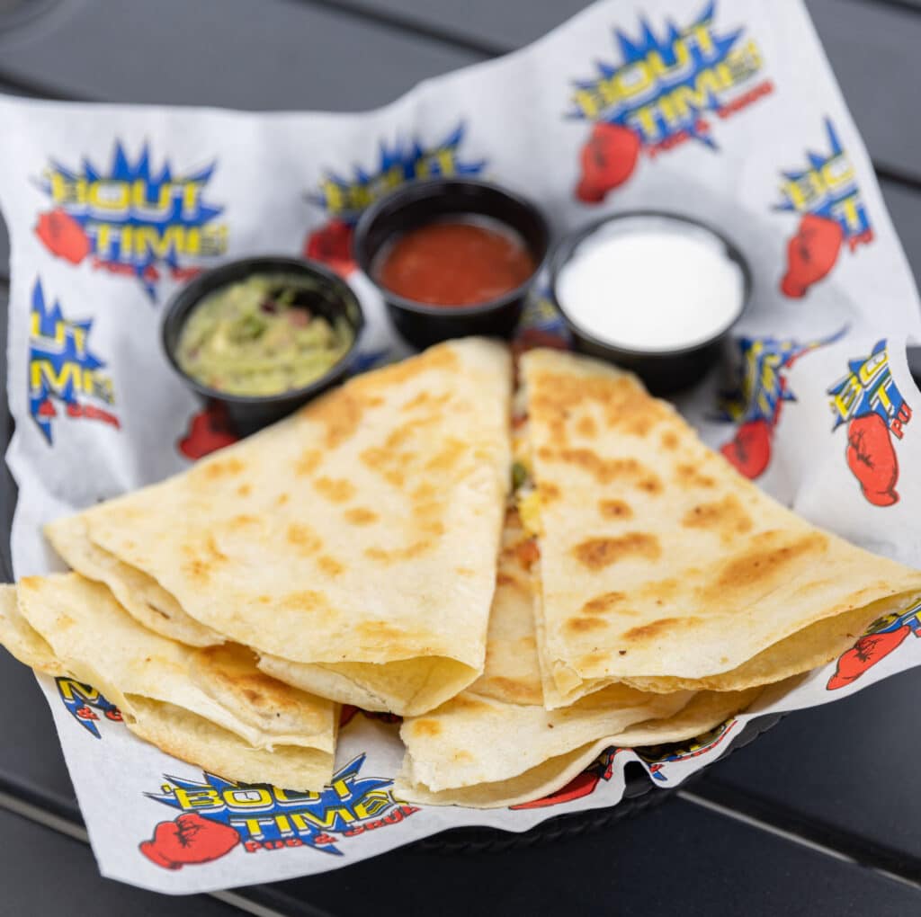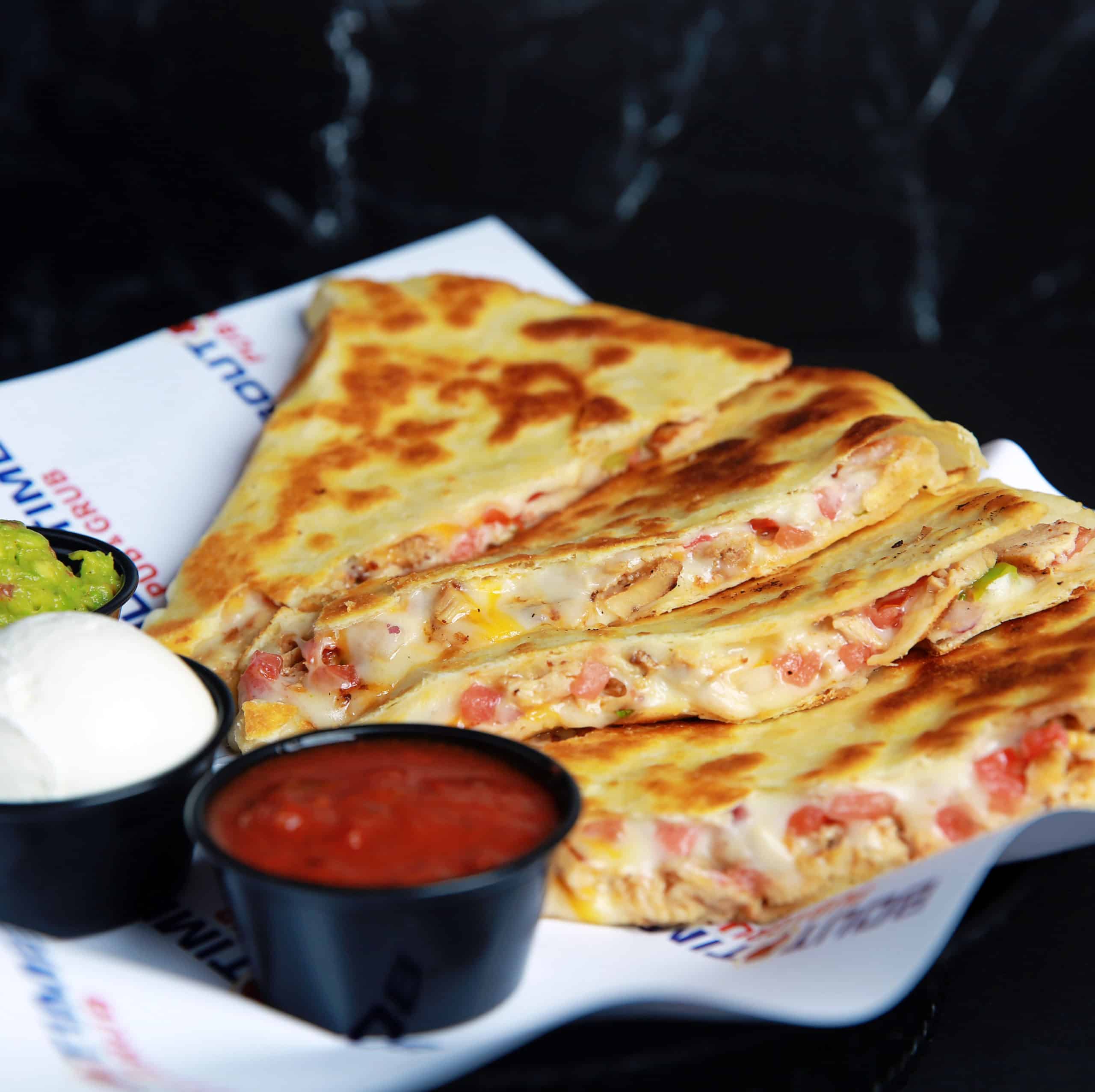 A flour tortilla stuffed with cheese and Pico de Gallo. Griddled to a golden brown and served with sour cream, salsa and fresh guacamole. Choose either chicken or steak.