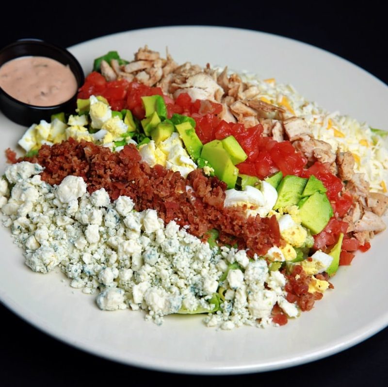 Salad greens topped with grilled chicken, diced egg, diced avocado, diced tomato, bleu cheese crumbles and diced bacon. Served with your choice of dressings.