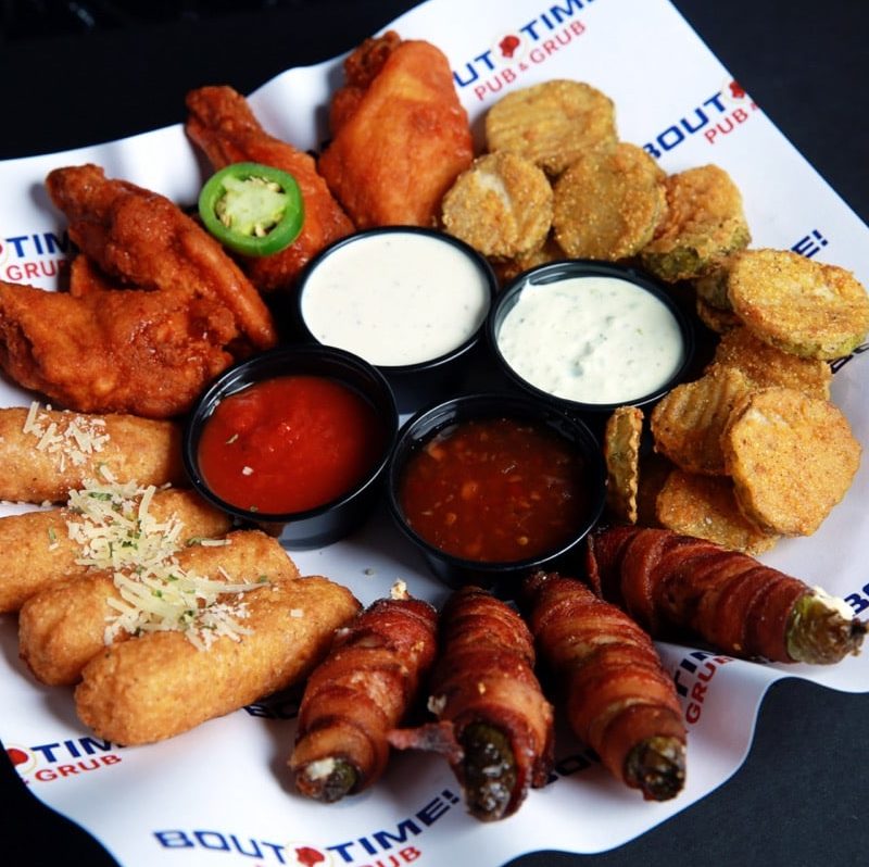 A shareable combination of wings, mozzarella sticks, fried pickle chips and stuffed jalapeños.