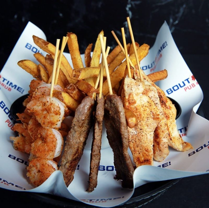 Our shareable combo of 3 each beef, chicken and shrimp skewers prepared grilled or battered and fried. Served on a bed of french fries. Solo Shot available too (3 skewers of the same protein).