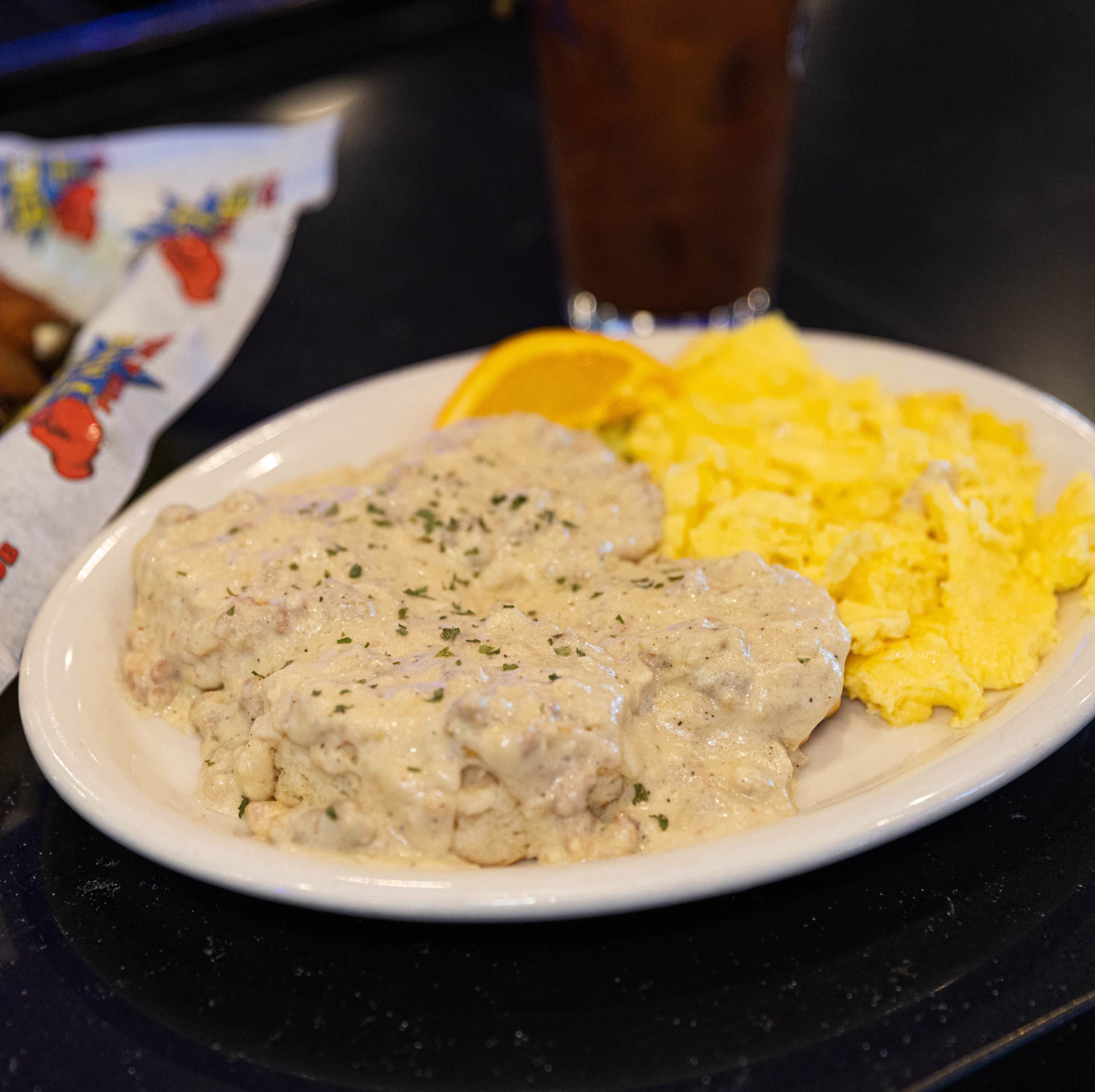 Biscuits topped our our house made sausage gravy. Served with two eggs any style.