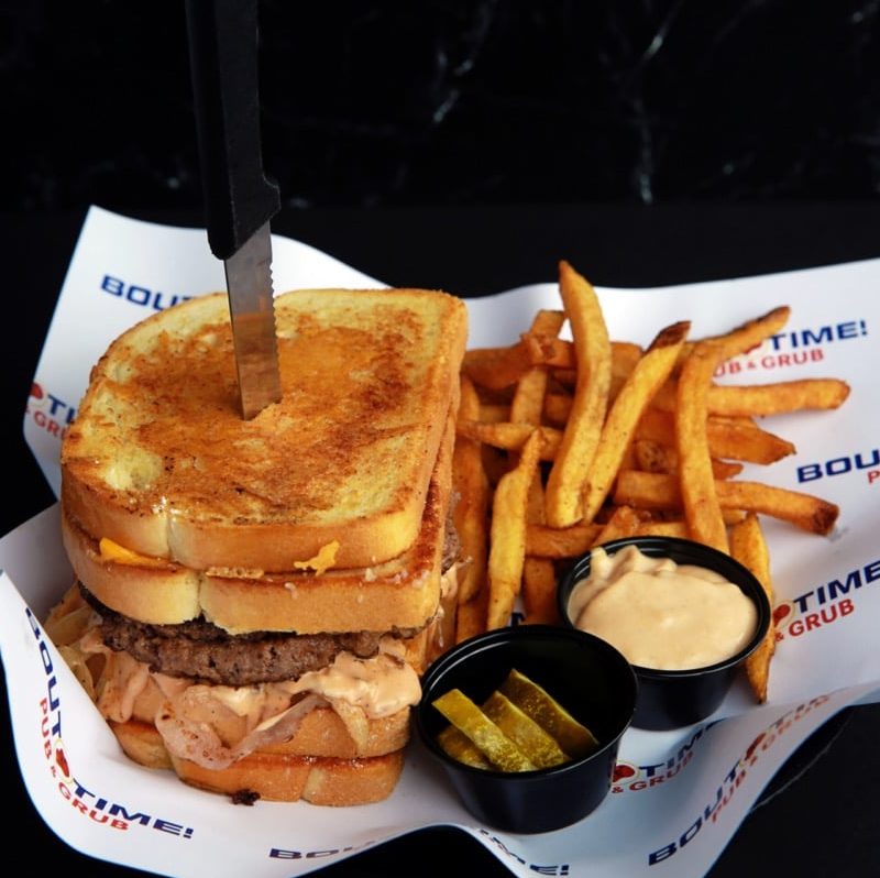 A ground chuck patty, sandwiched between two Parmesan cheese crusted grilled cheese sandwiches. Served with grilled onions and 1000 island dressing.